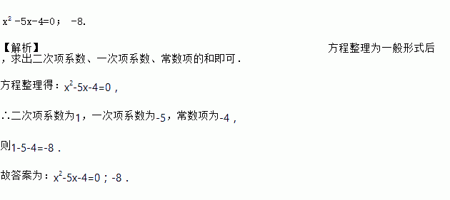 方程(2x+1)(x-3)=x2 +1化为一般形式为_______,二次项系数、一次项系数、常数项的和为_______.