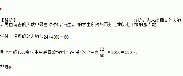 某校为了解七年级学生最喜欢的校本课程(厨艺课、数字与生活、足球、采茶戏)情况,随机抽取了部分七年级学生进行问卷调查,每名学生必须选且只能选一门.现将调查结果绘制成如图所示的两幅统计图.若该校七年级共有1050名学生,则其中最喜欢“数字与生活”的学生有( )