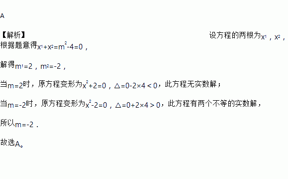 A 【解析】设方程的两根为x1,x2, 根据题意得x1+x2=m2-4=0, 解得m1=2,m2=-2, 当m=2时,原方程变形为x2+2=0,△=0-2×4<0,此方程无实数解; 当m=-2时,原方程变形为x2-2=0,△=0+2×4>0,此方程有两个不等的实数解, 所以m=-2. 故选A。