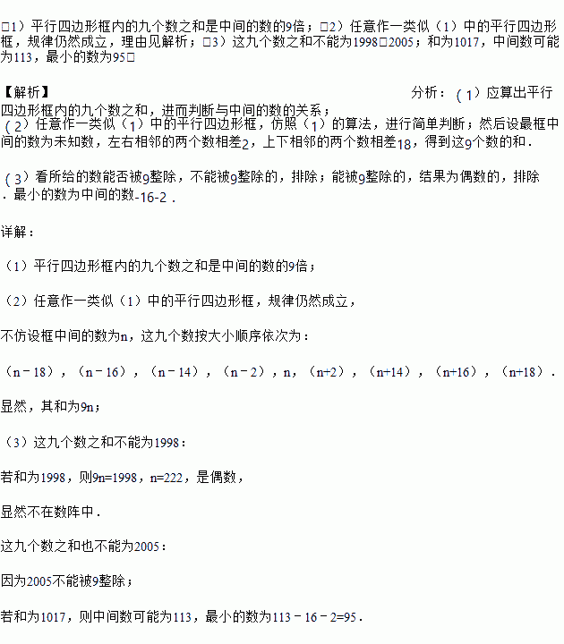 (2)在数阵图中任意作一类似(1)中的平行四边形框,这九个数之和还有这种规律吗?请说出理由;