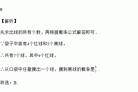在一个不透明的袋子中装有4个红球和3个黑球,它们除颜色外其他均相同,从中任意摸出一个球,则摸出黑球的概率是( )