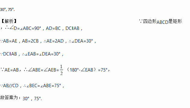 如图所示,在矩形ABCD中,AB=2BC,在CD上取点E,使AE= AB, 则∠EAB=_____,∠BEC=________.