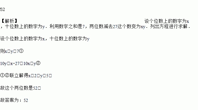 一个两位数的各数位上数字之和为7,这个两位数减去27后,它的十位数字与个位数字交换了位置,则这个两位数是________.