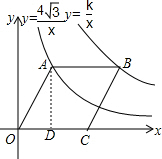 分析 首先根据点A在双曲线y=$\frac{4\sqrt{3}}{x}$(x>0)上,设A点坐标为(a,$\frac{4\sqrt{3}}{a}$),再利用含30°直角三角形的性质算出OA=2a,再利用菱形的性质进而得到B点坐标,即可求出k的值.