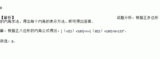 B 【解析】试题分析:根据正多边形的内角求法,得出每个内角的表示方法,即可得出答案. 【解析】 根据正八边形的内角公式得出:[(n﹣2)×180]÷n=[(8﹣2)×180]÷8=135°. 故选:B.