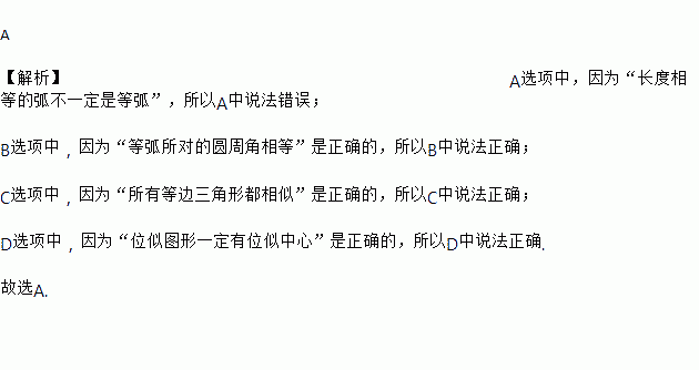 A 【解析】A选项中,因为“长度相等的弧不一定是等弧”,所以A中说法错误; B选项中,因为“等弧所对的圆周角相等”是正确的,所以B中说法正确; C选项中,因为“所有等边三角形都相似”是正确的,所以C中说法正确; D选项中,因为“位似图形一定有位似中心”是正确的,所以D中说法正确. 故选A.