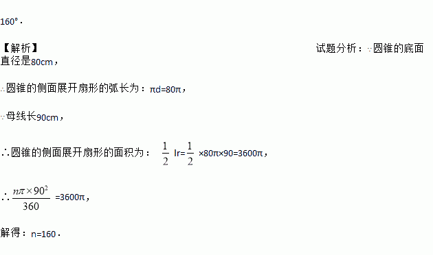 160°. 【解析】试题分析:∵圆锥的底面直径是80cm, ∴圆锥的侧面展开扇形的弧长为:πd=80π, ∵母线长90cm, ∴圆锥的侧面展开扇形的面积为: lr=×80π×90=3600π, ∴=3600π, 解得:n=160.
