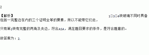 小明将一块三角形的玻璃棒摔碎成如图所示的四块(即图中标有1,2,3,4的四块),若只带一块配成原来一样大小的三角形,则应该带第_______块.