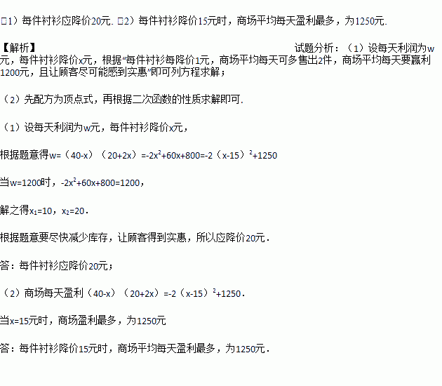 (1)若该商场平均每天要赢利1200元,且让顾客尽可能得到实惠,每件衬衫应降价多少元?