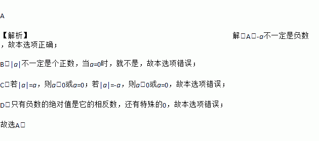 A 【解析】解:A.-a不一定是负数,故本选项正确; B.|a|不一定是个正数,当a=0时,就不是,故本选项错误; C.若|a|=a,则a>0或a=0;若|a|=-a,则a<0或a=0,故本选项错误; D.只有负数的绝对值是它的相反数,还有特殊的0,故本选项错误; 故选A.