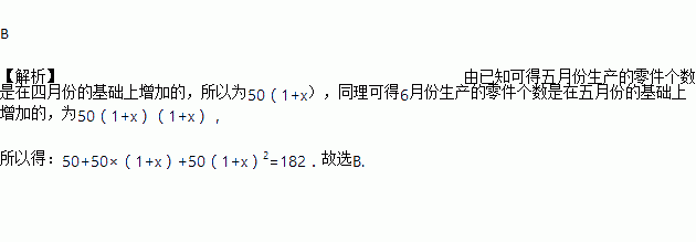 某农机厂4月份生产零件50万个,第二季度共生产零件182万个.设该厂5,6月份平均每月的增长率为x,那么x满足的方程是( )