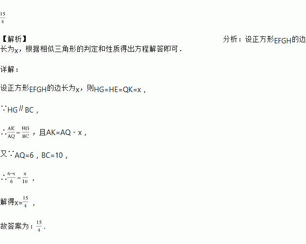 如图,在锐角△ABC中,BC=10,BC上的高AQ=6,正方形EFGH的顶点E、F在BC边上,G、H分别在AC、AB边上,则此正方形的边长为_____.