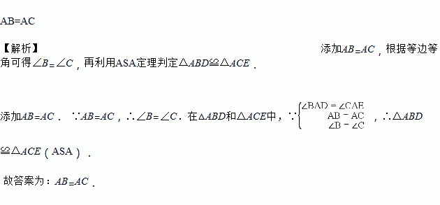 如图,△ABC中,点D、E在BC边上,∠BAD=∠CAE请你添加一对相等的线段或一对相等的角的条件,使△ABD≌△ACE.你所添加的条件是________