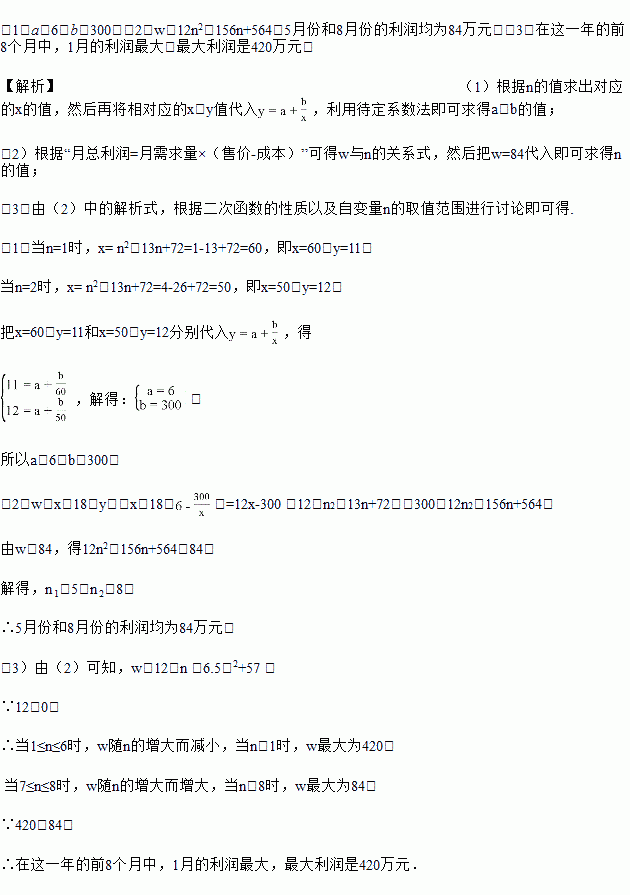 (a,b为常数).经市场调研发现,月需求量x与月份n (n为整数,1≤n≤12)的关系式为x=n2-13n+72,且得到了下表中的数据.