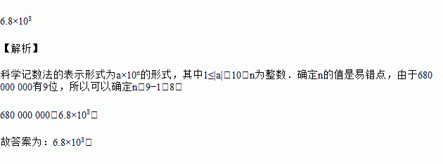 我国因环境污染造成的巨大经济损失每年高达680000000元,这个数用科学记数法表示为 ▲ 元.