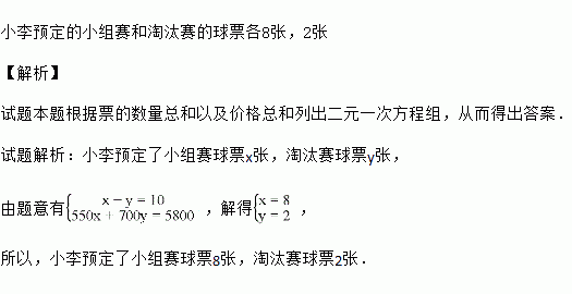 2014年世界杯足球赛在巴西举行,小李在网上预定了小组赛和淘汰赛两个阶段的球票共10张,总价为5800元,其中小组赛球票每张550元,淘汰赛球票每张700元,问小李预定了小组赛和淘汰赛的球票各多少张?