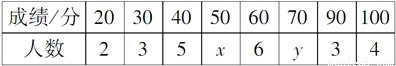 下面为某班某次数学测试成绩的分布表.已知全班共有38人,且众数为50分,中位数为60分,则x2-2y的值为( )