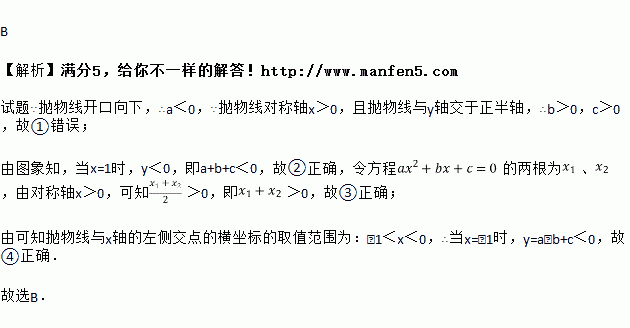 (a≠0)的图象如图所示,则下列结论:①b<0,c>0;②a+b+c<0;③方程的两根之和大于0;④a﹣b+c<0,其中正确的个数是( )