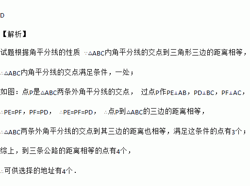 如图,直线a,b,c表示三条公路,现要建一个货物中转站,要求它到三条公路的距离相等,则可供选择的地址有( )