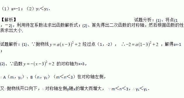 (1)a=-1;(2)y1<y2. 【解析】试题分析:(1)、将点(1,-2),利用待定系数法求出函数解析式;(2)、首先得出二次函数的对称轴,然后根据函数的性质求出大小. 试题解析:(1)、∵抛物线经过点(1,-2), ∴,解得a=-1; (2)、∵函数的对称轴为x=3, ∴ A(m,y1)、B(n,y2)(m<n<3)在对称轴左侧, 又∵抛物线开口向下,∴ 对称轴...