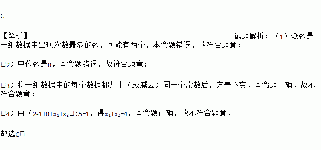 C 【解析】试题解析:(1)众数是一组数据中出现次数最多的数,可能有两个,本命题错误,故符合题意; (2)中位数是0,本命题错误,故符合题意; (3)将一组数据中的每个数据都加上(或减去)同一个常数后,方差不变,本命题正确,故不符合题意; (4)由(2-1+0+x1+x2)÷5=1,得x1+x2=4,本命题正确,故不符合题意. 故选C.