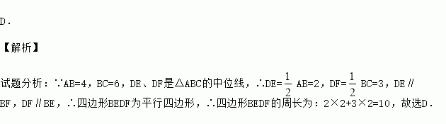 如图,在△ABC中,AB=4,BC=6,DE、DF是△ABC的中位线,则四边形BEDF的周长是( )