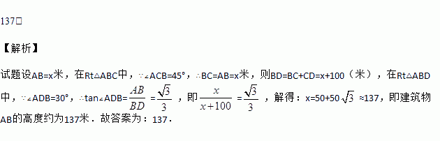 如图所示,为了测量出一垂直水平地面的某高大建筑物AB的高度,一测量人员在该建筑物附近C处,测得建筑物顶端A处的仰角大小为45°,随后沿直线BC向前走了100米后到达D处,在D处测得A处的仰角大小为30°,则建筑物AB的高度约为______米.