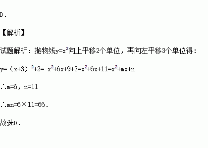 抛物线y=x2+mx+n可以由抛物线y=x2向上平移2个单位,再向左平移3个单位得到,则mn值为( )