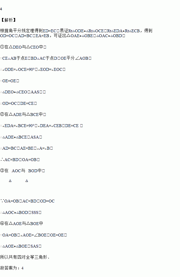 如图,OE平分∠AOB,BD⊥OA于点D,AC⊥BO于点C,则图中全等三角形共有_______对.