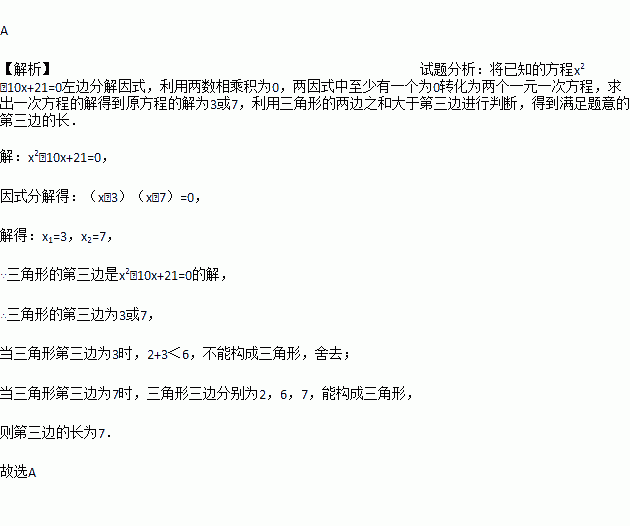 三角形的两边长分别为2和6,第三边是方程x2-10x+21=0的解,则第三边的长为 ( )
