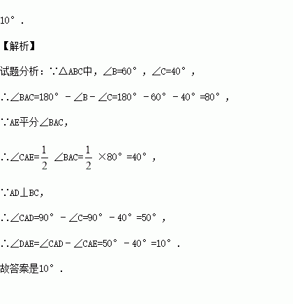 如下图,在△ABC中,∠B=600,∠C=400,AD⊥BC于D,AE平分∠BAC;则∠DAE= .