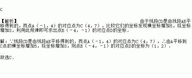 线段CD是由线段AB平移得到的.点A(–1,4)的对应点为C(4,7),则点B(– 4,– 1)的对应点D的坐标为( )