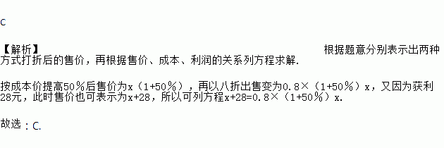 一件毛衣先按成本提高标价,再以8折出售,获利28元,求这件毛衣的成本是多少元,若设成本是x元,可列方程为( )
