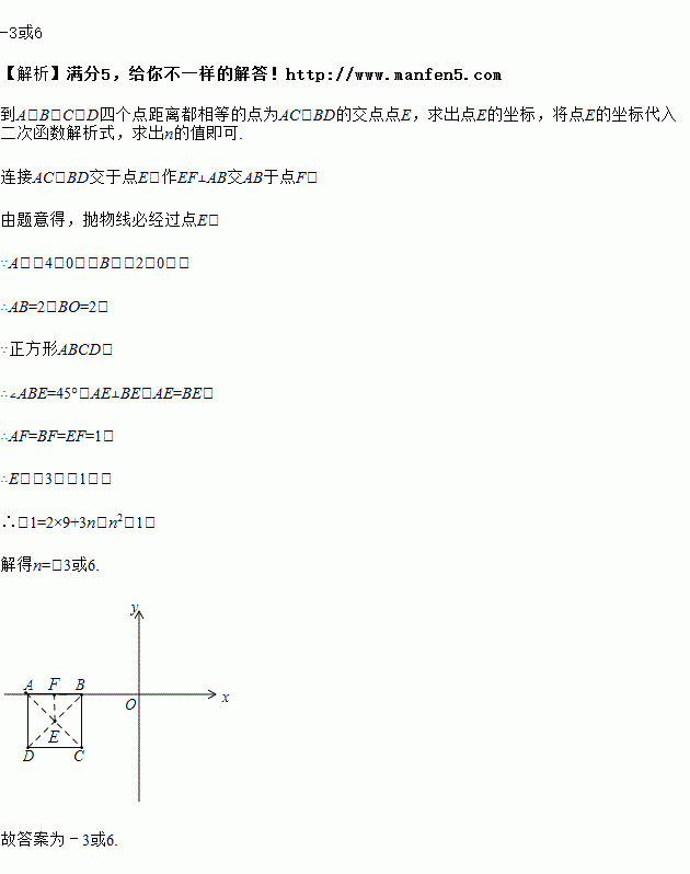 如下图,正方形ABCD的边AB在x轴上,A(﹣4,0),B(﹣2,0),定义:若某个抛物线上存在一点P,使得点P到正方形ABCD四个顶点的距离相等,则称这个抛物线为正方形ABCD的“友好抛物线”.若抛物线y=2x2﹣nx﹣n2﹣1是正方形ABCD的“友好抛物线”,则n的值为_____.