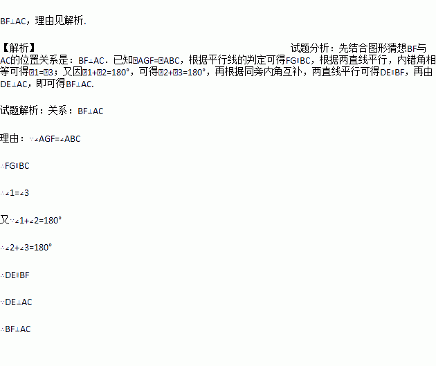 已知如图,DE⊥AC,∠AGF=∠ABC,∠1+∠2=180°,试判断BF与AC的位置关系,并说明理由.