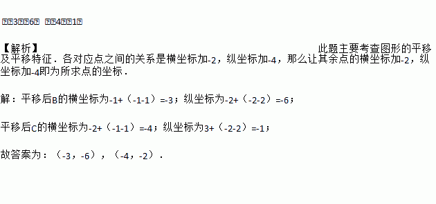 三角形ABC的三个顶点A(1,2),B(-1,-2),C(-2,3),将其平移到点A′(-1,-2)处,且使A与A′重合,则B、C两点对应点的坐标分别为________,________.