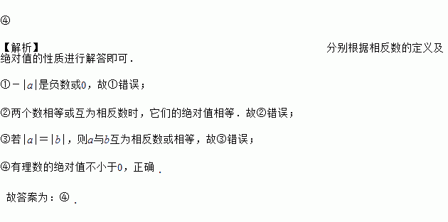 ①-|a|一定是负数;②两个数只有相等时,它们的绝对值才相等;③若|a|=|b|,则a与b互为相反数;④有理数的绝对值不小于0.