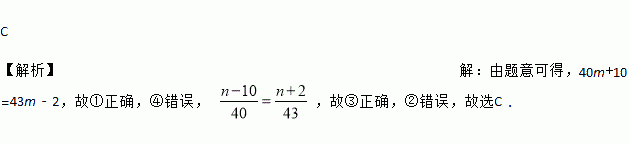 C 【解析】【解析】 由题意可得,40m+10=43m﹣2,故①正确,④错误, ,故③正确,②错误,故选C.
