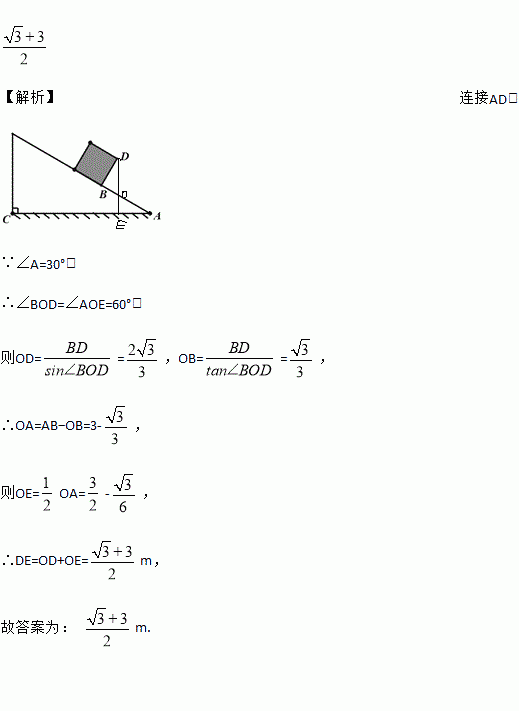 一个长方体木箱沿斜面下滑,当木箱滑至如图所示位置时,AB=3m,已知木箱高BD=1m,斜面坡角为30°,则木箱端点D距地面AC的高度为________.