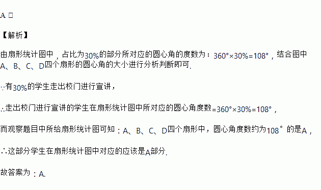 某校组织学生开展“八荣八耻”宣传教育活动,其中有30%的同学走出校门进行宣讲,这部分学生在扇形统计图中应为_____部分.