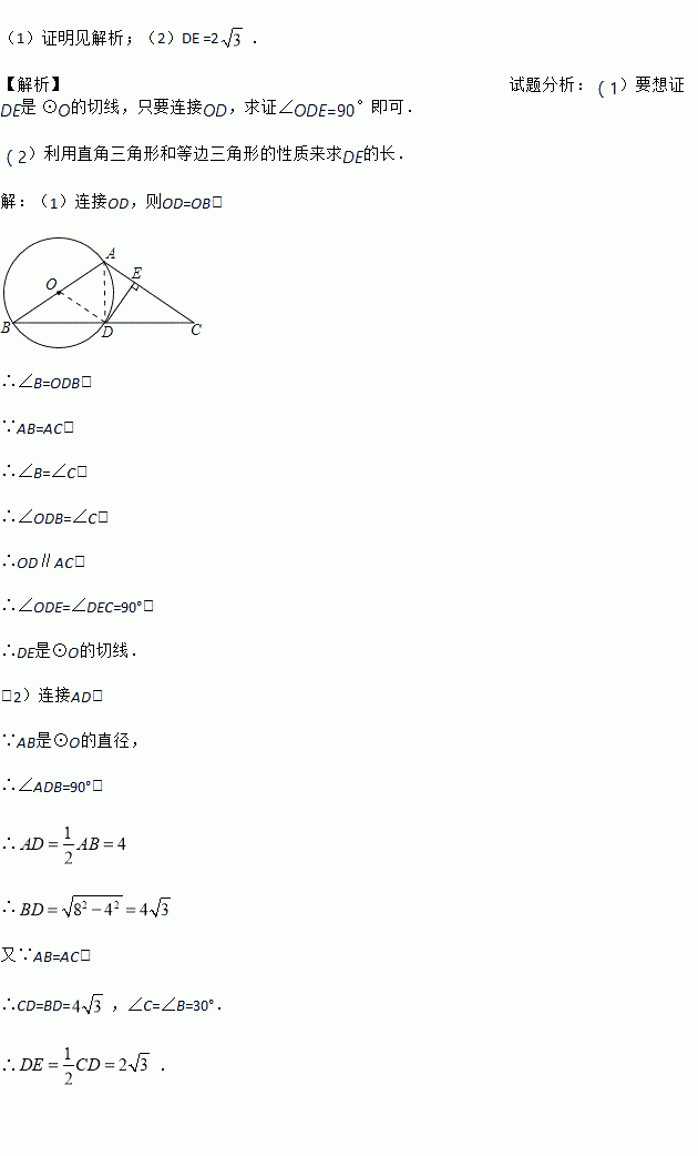 如图,在△ABC中,AB=AC,以AB为直径的⊙O交BC于点D,过点D作DE⊥AC于点E.