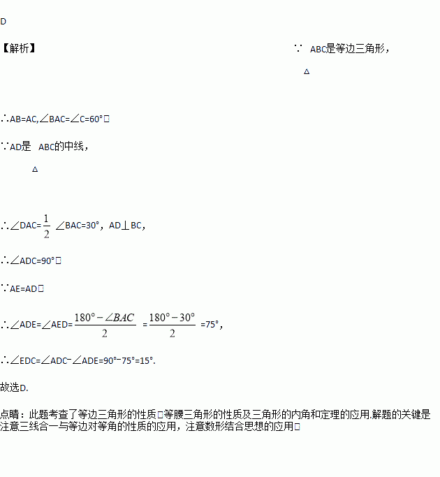 如图,AD是等边三角形ABC的中线,AE=AD,则∠EDC=( )度.