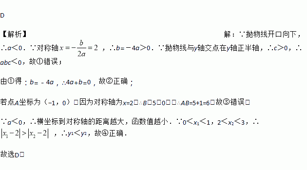 图象与x轴交于A,B两点,对称轴为直线x=2,下列结论:①abc>0; ②4a+b=0;③若点A坐标为(?1,0),则线段AB=5; ④若点M(x1,y1)、N(x2,y2)在该函数图象上,且满足0<x1<1,2<x2<3,则y1<y2其中正确结论的序号为( )