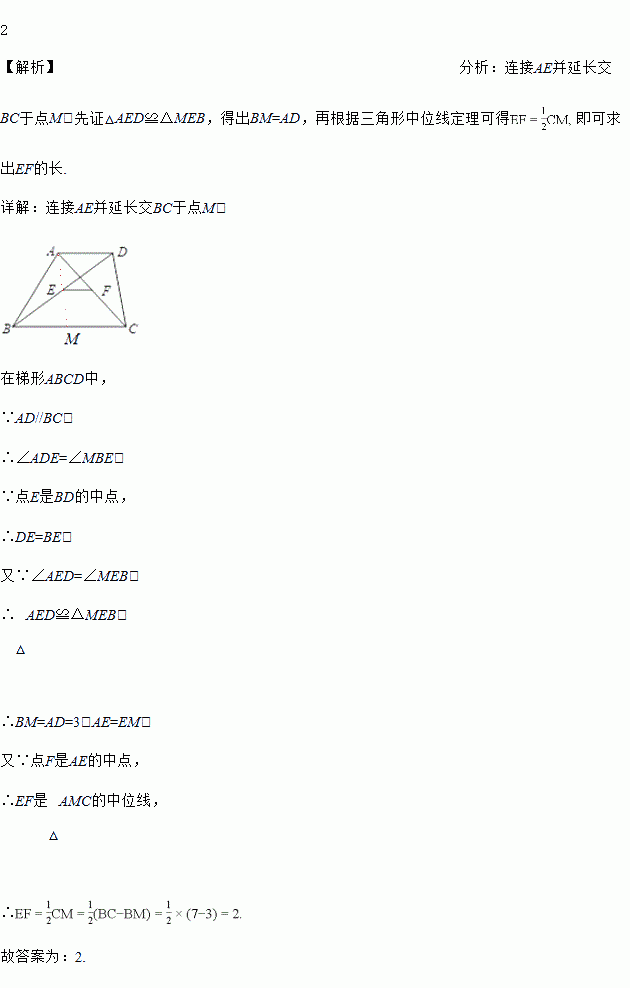 如图,在梯形ABCD中,AD//BC,AD=3,BC=7,如果点E、F分别是AC、BD的中点,那么EF的长为_________.