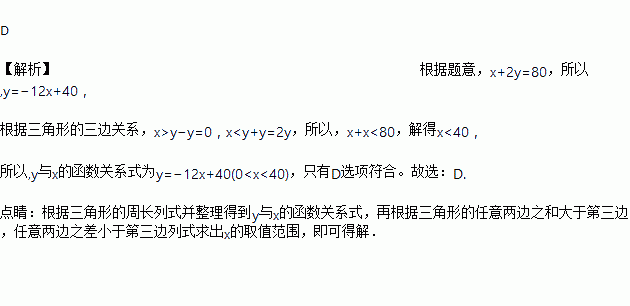 若等腰三角形周长是80 cm,则能反映这个等腰三角形的腰长y cm与底边长x cm函数关系的图象是( ).