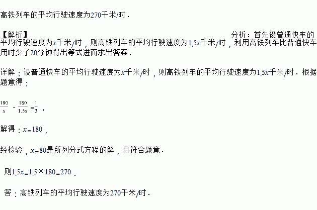 2017年12月29日,国家发改委批复了昌景黄铁路项目可行性研究报告.该项目位于赣皖两省,线路起自江西省南昌市南昌东站,经上饶市、景德镇市,安徽省黄山市,终至黄山北站.按照设计,行驶180千米,昌景黄高铁列车的平均行驶速度是普通快车的1.5倍,用时比普通快车用时少20分钟,求昌景黄高铁列车的平均行驶速度.