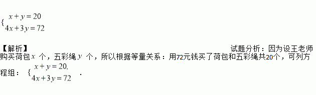 端午节时,王老师用72元钱买了荷包和五彩绳共20个.其中荷包每个4元,五彩绳每个3元,设王老师购买荷包x个,五彩绳y个,根据题意,列出的方程组是________.