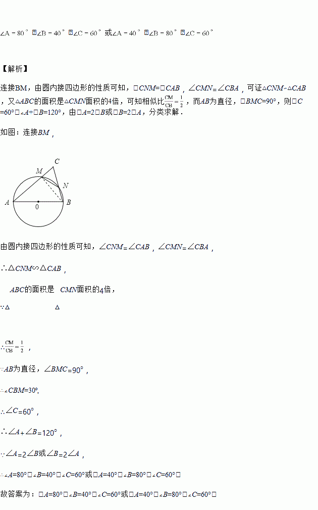 如图,以的边为直径画圆,与边交于,与边交于,已知的面积是面积的倍,中有一个内角度数是另一内角度数的倍,试计算三个内角的度数:________.