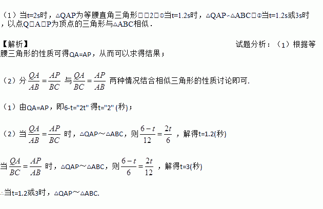 (2)当t为何值时,以点Q、A、P为顶点的三角形与△ABC相似?