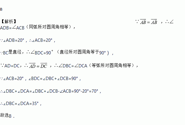 B 【解析】∵ ,∴∠ADB=∠ACB(同弧所对圆周角相等), ∵∠ADB=20°,∴∠ACB=20°, ∵BC是直径,∴∠BDC=90°(直径所对圆周角等于90°), ∵AD=DC,∴,∴∠DBC=∠DCA(等弧所对圆周角相等), ∵∠ACB=20°,∠BDC=∠DBC+∠DCB=90°, ∴∠DBC+∠DCA=∠DBC+∠DCB-∠ACB=90°-20°=7...